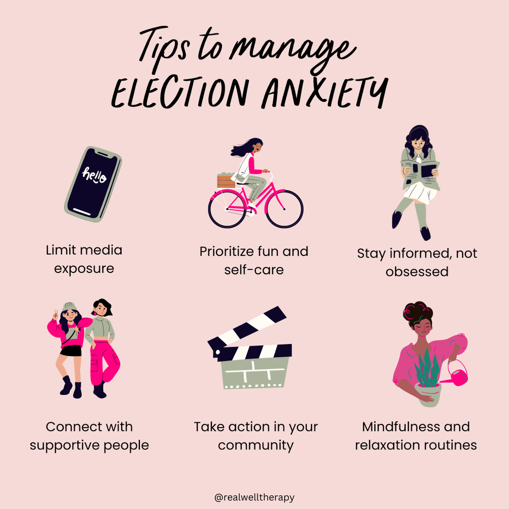 Identity and representation: Concerns about policies affecting specific demographics can amplify anxiety. For women, this might involve reproductive rights or workplace equality. Teens might worry about education policies or climate change legislation that will shape their future. Climate anxiety is another very real phenomenon, and it happens to be deeply intertwined with election anxiety. Both reflect a shared fear of future outcomes and their long-term impacts - you can read more about climate anxiety here.