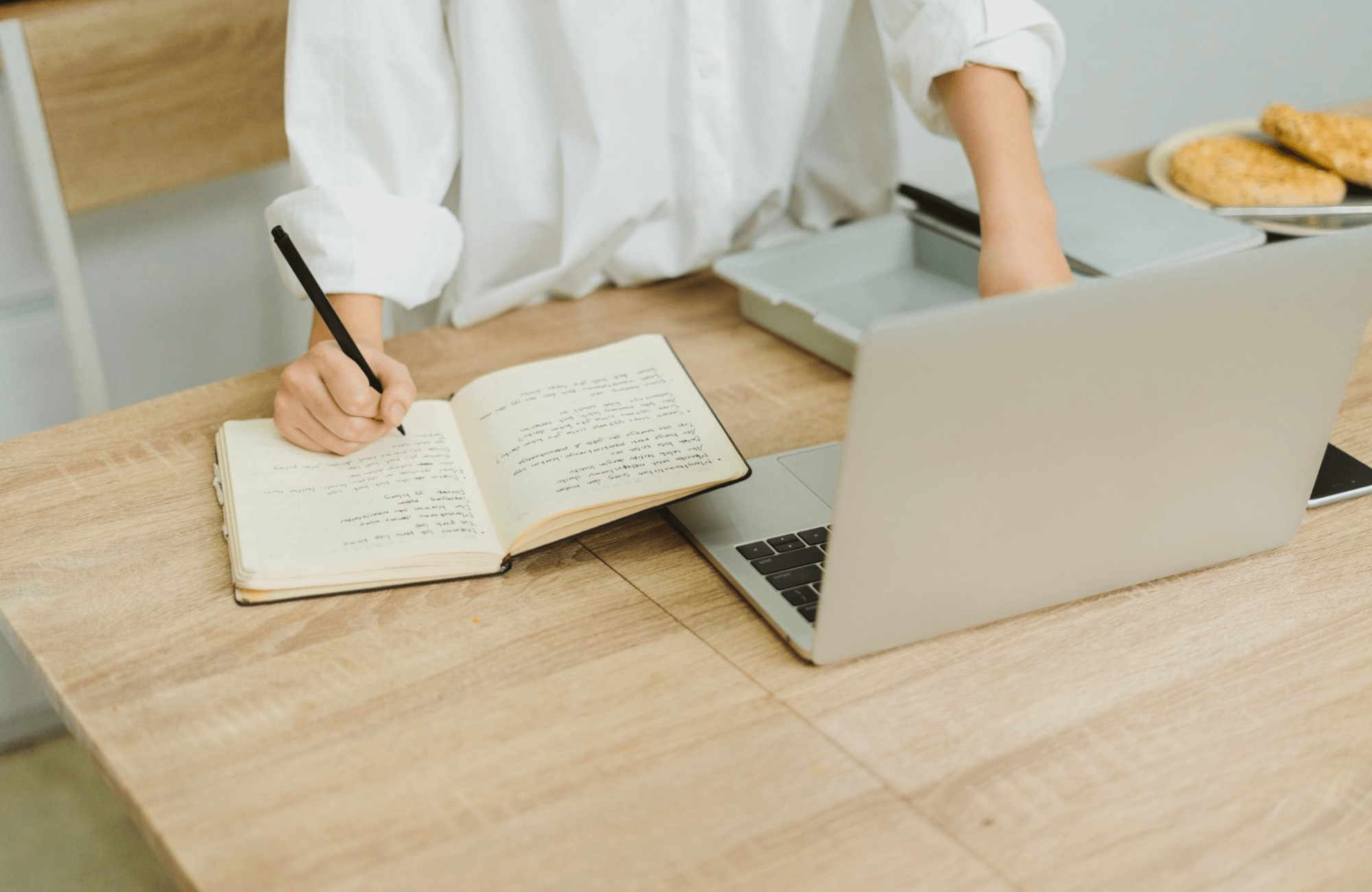 Minimal desk with a laptop, plant, and coffee in a bright room, representing a calm and supportive environment for high-functioning anxiety therapy